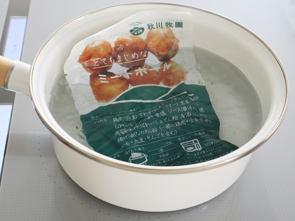 湯せんの場合は、沸騰したたっぷりのお湯に凍った状態の製品を袋のまま入れ、中火で加熱。