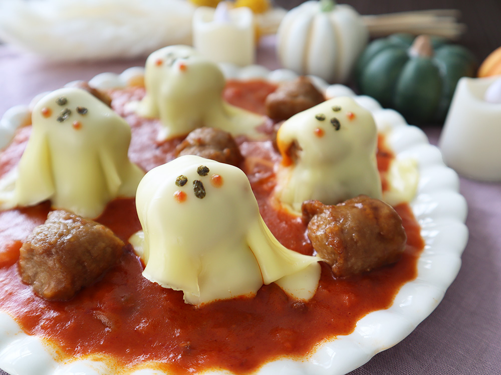 チーズをまとい、目や口を装飾したミートボールは、なんとも可愛らしくいつもと違った印象に♪