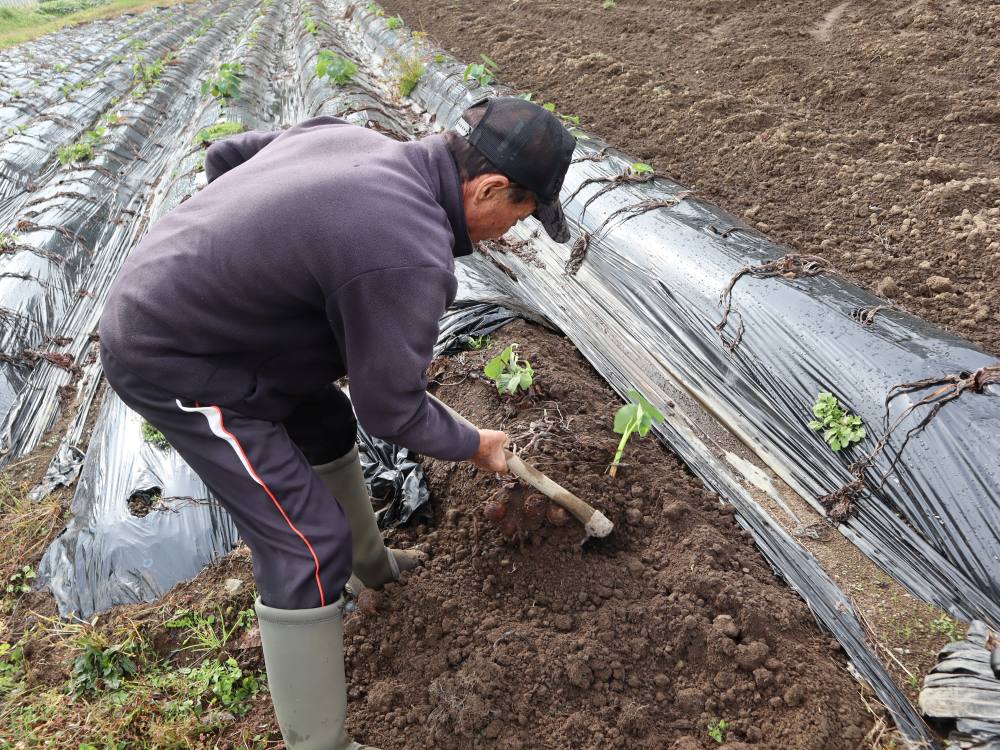 土の中から種芋を掘り出し、堆肥を入れてマルチを張ったあとに植えていきます。