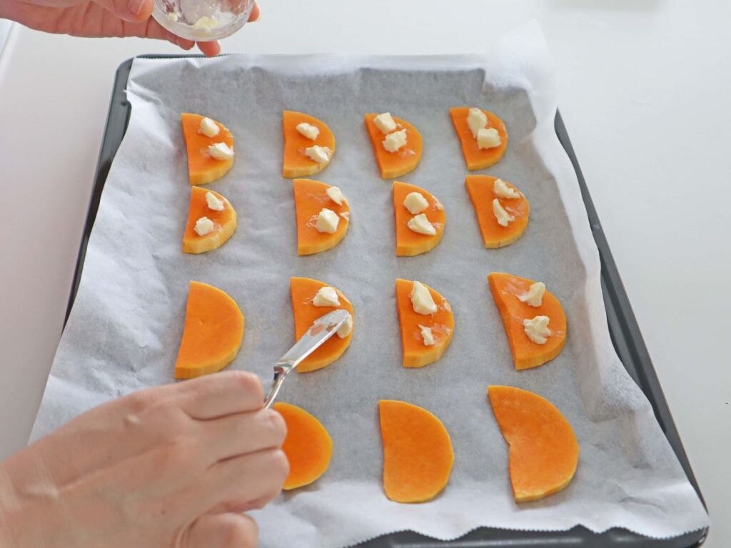3.オーブンシートを敷いた天板にバターナッツかぼちゃを並べ、表面にバターを薄く塗り、200℃のオーブンで10~12分ほど焼く。