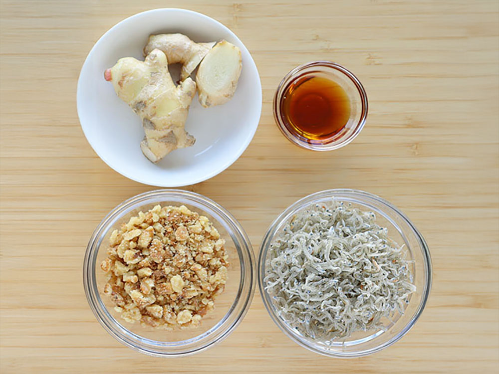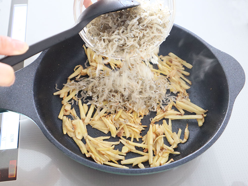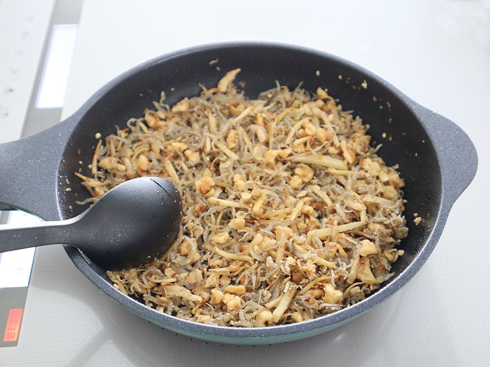 しょうがと相性の良いじゃこを加え、カリカリになるまで加熱することで、ふりかけのようなおもしろい食感になります。