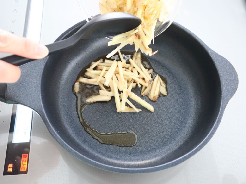 2.フライパンにごま油を入れて熱し、1のしょうがを加えて中火で炒める。