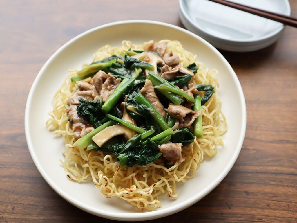 家族がよろこぶ!ワザあり!小松菜と豚肉のあんかけ焼きそば【管理栄養士レシピ】